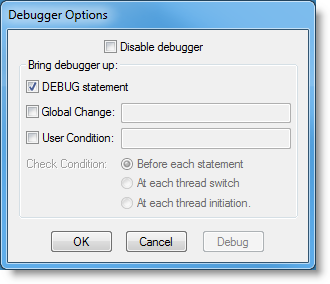 DEBUG statement Displays the Debugger dialog every time a DEBUG statement is encountered in an enabled process while running the simulation.