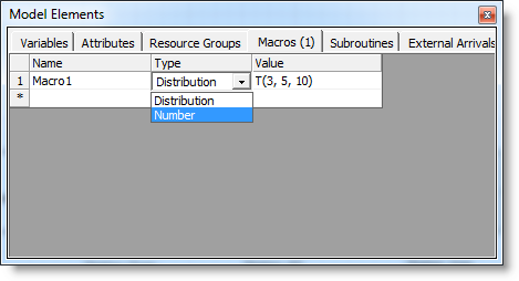 Access to Variables (global), Attributes, Resource Groups, Macros, Subroutines and External Arrivals can be found in the Model Elements dialog, which is accessible from the Process Simulator menu and toolbar.