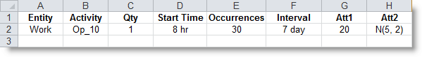 The arrival of the Work entity at activity Op_10 will occur for the first time eight hours after the start of the simulation. Each arrival brings 1 new entity. The arrival will be repeated 30 times (unless the simulation run length is too short) with an interval of 7 days. The attribute Att1 is initialized with a value of 20, whereas Att2 will be assigned an initial value from the distribution N(5, 2).