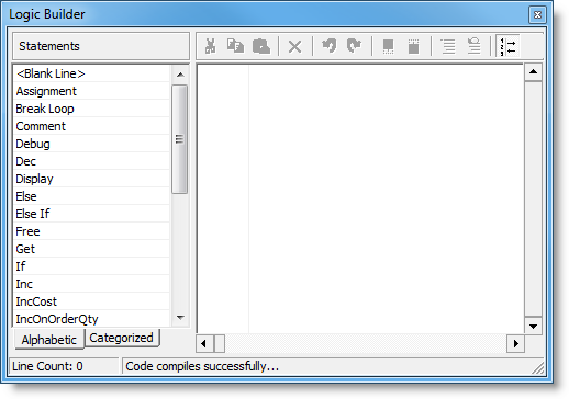 The toolbar in the Logic Builder allows you to manipulate the lines of code in the logic window. You must first select a line of code in the logic window before using the options in the toolbar.