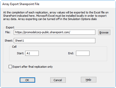 See Export Arrays to Spreadsheets for more information on the other fields in the Array Export SharePoint File dialog box.