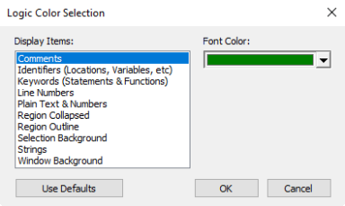- When the Logic Color Selection dialog box appears, select from the Display Items list the logic component to which you want to apply a colored text. Note that the Selection Background option allows you to change the highlighting color that appears when you do a press-and-drag motion to select a portion of the logic text.