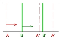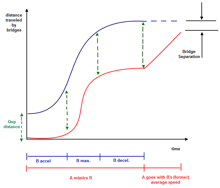 If bridge A is queued up behind bridge B, bridge A goes through up to two stages of movement. The first stage occurs throughout the movement of bridge B. Bridge A mimics bridge B’s motion, maintaining its original distance from bridge B.