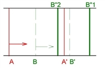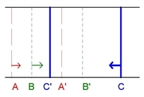Bridge B starts moving first from [B] to [B'], claiming zone [B~B'] in the Æ direction. Bridge A wants to move from A to A' and starts moving behind B. Bridge C wants to move in the opposite direction with a higher move priority than both of the other bridges. ProModel interrupts bridges A and B and lays a new course for both bridge B [B'' = C' - bridge separation] and bridge A [A'' = B'' - bridge separation]. In this case, B may queue up behind A, and C behind B.