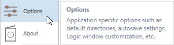 The Options section in the File application menu provides access to application level settings in the Options dialog and product version and Serial Number in the About window.