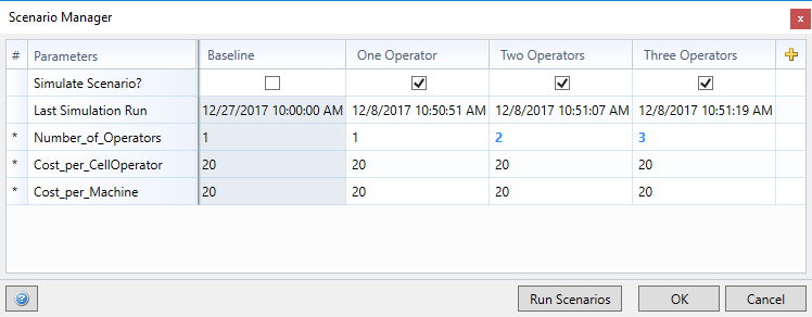 Parameters are listed as rows under the Scenario columns. In addition, there is a row for the Last Simulation Run, which, if there is output for that scenario, lists the date and time that the scenario was last run.