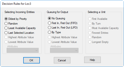 No Queuing Entities that have completed their operations at the current location are free to route to other locations independent of other entities that have finished their operations. If this option is selected it is not displayed in the Rules Box.
