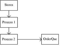 This section shows how to use the SEND statement to model a pull system. The diagram below shows the pull system we will model. Orders for finished goods arrive at the OrderQue. The arriving order triggers the release of a unit from the location Stores. The order continues to wait at OrderQue until the unit goes through Processes 1 and 2. At Process_1, Unit processes for two minutes. At Process_2, Unit processes for four minutes. Finally, the Unit joins to the requesting order waiting in the OrderQue.