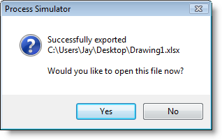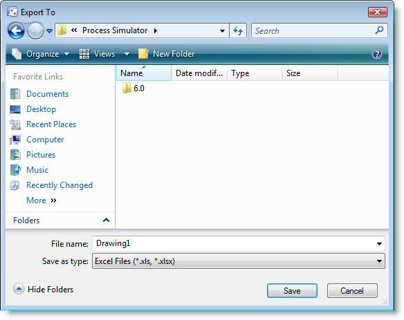 When you select the option to export the data from your Process Simulator model, you will be prompted to choose the file name and directory where you would like to export your data. A suggested filename will be automatically entered as <model name>.xlsx, however, it can be changed before the export occurs.