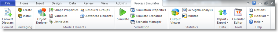 The Process Simulator ribbon is provided with all the options needed to define simulation data, run simulation models, and review model the results. The options include: