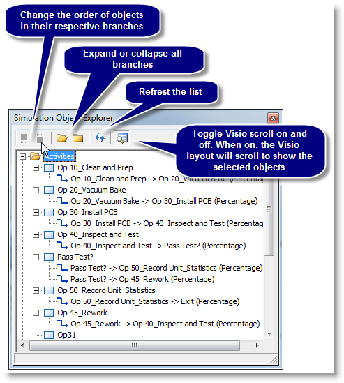 The Simulation Object Explorer displays a tree view of all the objects in your model. This is helpful for understanding how the shapes and connections in your model interact. The explorer is also useful for reordering. This is done using the up and down arrows in the dialog's toolbar. The connections between activities may be moved to determine the order that entities will route from one activity to several available activities.