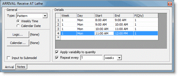 Define your arrivals based upon a custom pattern where varying quantities of entities arrive over the course of a day. Enter the week number, weekday, start and end time, and quantity to arrive during the time specified if the Pattern Arrival is set to Weekly Time. Enter the specific date, if set to Calendar Date. The Start and End times define the duration over which the quantity of entities will be randomly distributed. Each row can define a unique duration and quantity and all rows together define a custom pattern for the arriving entities. A pattern arrival is most commonly used to model the arrival of people into a system like patients into a health clinic or customers arriving into a bank.