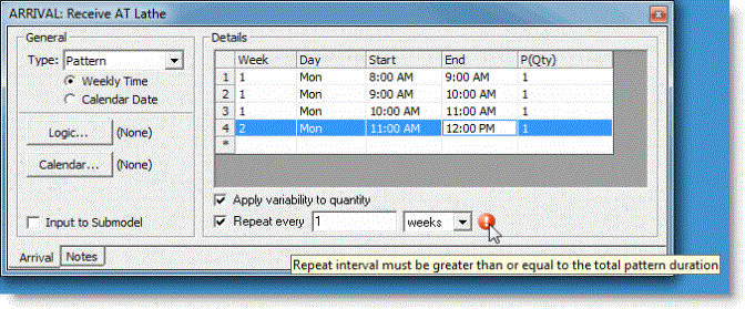 If you use a Pattern arrival in your model, your simulation run length must be defined by either Weekly Time or Calendar Date, not Time Only. The start time for each row must also be the same or later than the end time of the previous row. See Simulation Properties for more information.