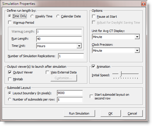 The Simulation Properties dialog enables the user to define parameters for running the simulation, such as, simulation time and warm-up period. The simulation properties can be opened in one of three ways: