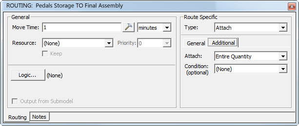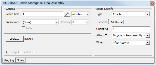 Attach is selected as the type of routing in the Routing dialog. In the case of the pedals, the quantity is set to 2. Under the Additional tab, be sure to select Entire Quantity in the Attach list.