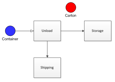 Incoming shipments arrive in containerized cartons with 100 cartons to a container. At an unload activity the cartons are removed (“created”) from the container and stored. The empty containers are then routed to shipping to go back to the supplier.