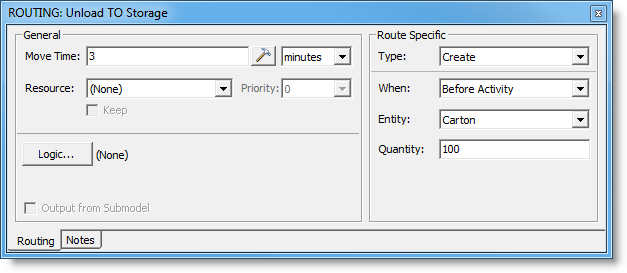 A Create routing is defined from Unload to Storage for 100 containers. The container itself is routed on to Shipping.